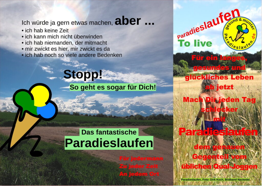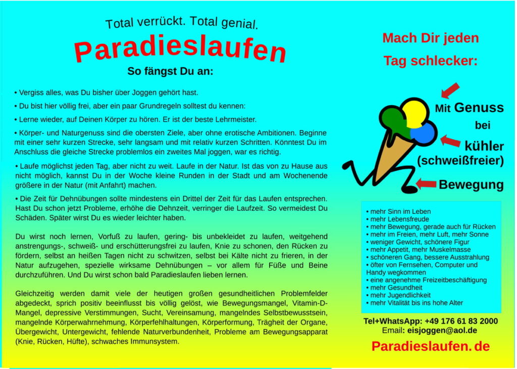 Ich gebe wieder die Gelegenheit, mit mir das Paradieslaufen (KEW Movehacking) praktisch kennenzulernen. Von geschütztem Ort aus eine kleine Runde im Adamskostüm durch herrliche Natur joggen. Der eigenen Kondition angepasst – ein erstes Hineinschnuppern in die fantastische Welt des weitgehend anstrengungs-, schweiß- und erschütterungsfreien, angenehmsten und mit Abstand gesündesten Sports/ Gymnastik altgriechischer Art.